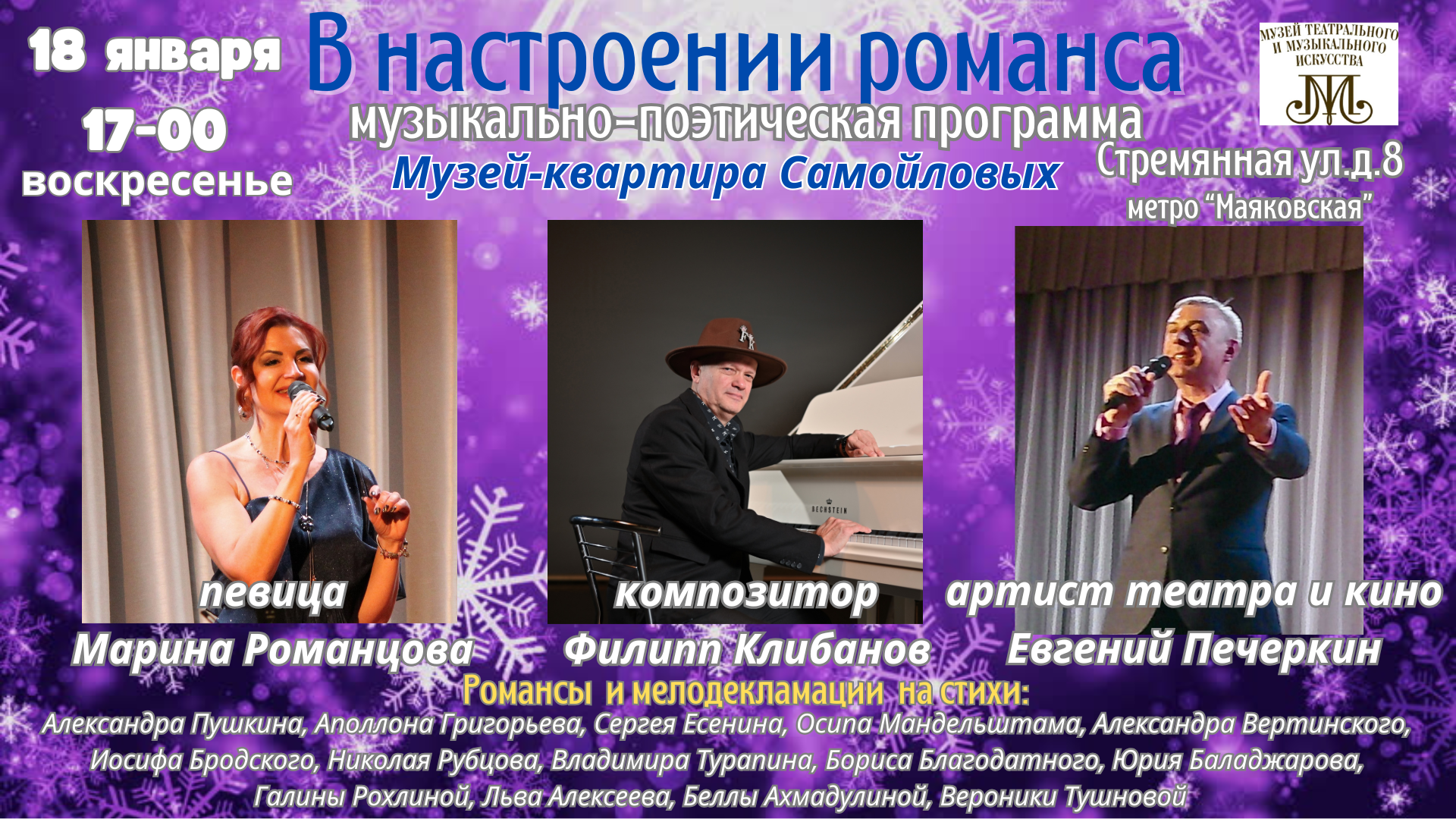 В программе прозвучат романсы Александра Вертинского и современных петербургских композиторов Филиппа Клибанова, Светланы Славии. Владимира Фёдорова и Марины Романцовой на стихи Николая Рубцова, Аполлона Григорьева, Иосифа Бродского, Бориса Благодатного, Юрия Баладжарова, Галины Рохлиной, Светланы Лисиенкоаой, Софьи Мустафаевой, Ирины Важинской и стихи Сергея Есенина, Александра Сергеевича Пушкина, Анны Ахматовой, Николая Гумилёва, Давида Самойлова, Александра Вертинского, Вероники Тушновой.